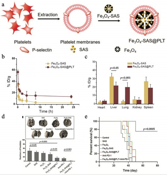 Cellular vesicles, with their hollow-core structure, are widely regarded as an excellent option for delivering drugs because they are non-immunogenic, have low toxicity, and are biocompatible [82]. A combination of cellular vesicles and nanoparticles can be easily mixed and then prepared for transportation into the desired cell membrane-coated nanoparticles using co-extrusion or ultrasonication techniques [83]. Cancer immunotherapy utilizes drugs or biological substances to regulate the immune system and stimulate a suitable immune reaction for the prevention and treatment of cancer. The tumor microenvironment (TME) is a critical factor in tumor immunity and closely influences tumor initiation and progression. It is characterized by vascular abnormalities, low pH levels, and hypoxia, which collectively contribute to immunosuppression. This immunosuppressive TME presents a significant challenge for effective antitumor immunotherapy strategies [84,85]. By remodeling the TME, immune cells can infiltrate more effectively, and tumor growth and metastasis can be suppressed [86,87]. However, precise drug delivery to tumors remains a challenge. Cancer immunotherapy can be effectively pursued through the use of cell-membrane-derived nanoparticles (CMNPs). CMNPs leverage a patient’s tumor cells to create personalized therapy, while their polymer core can hold numerous medications, thereby boosting the immune response against the tumor. Furthermore, CMNPs can envelop immunotherapeutic drugs and employ immune cell membranes derived from leukocytes and cytotoxic lymphocytes to produce immune factors, thereby enhancing their immunotherapy potential [88]. In a study by Jiang and colleagues [89], an innovative strategy was employed to merge mild immunogenic ferroptosis with immune checkpoint blockade therapy targeting PD-1 to treat cancer. Fe3O4-SAS@PLT nanoparticles were synthesized by loading sulfasalazine (SAS) onto plated membrane (PLTM)-coated Fe3O4 magnetic nanoparticles. Fe3O4-SAS@PLT specifically targeted tumors in mice by expressing p-selectin on PLTM, and ferroptosis was induced at the tumor site. As a result, an immune response is activated (Figure 6a). The tumor site continued to show a significant signal even 24 h after injection, indicating that the presence of PLTM enabled Fe3O4-SAS@PLT to avoid detection by immune cells and prolong its circulation period (Figure 6b,c). Moreover, the immune reaction induced by Fe3O4-SAS@PLT improved the effectiveness of PD-1 blockers, leading to limited tumor metastasis and extending survival time in mice with metastatic conditions (Figure 6d,e).