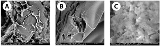 Figure 2 demonstrates the surface morphology and pore size of the GelMA+ hydrogels at concentrations of 20% w/v and 30% w/v via SEM. The images provide a visual representation of the internal porous structure of both GelMA+ formulations. In Figure 2A, the morphology of the pre-polymerized GelMA exhibits a highly porous surface, with estimated pore sizes ranging from 150 µm to 300 µm. Figure 2B,C exhibit the internal porous structures of the 20% and 30% w/v GelMA+ hydrogels, respectively. The surface of the 20% w/v GelMA+ exhibits a porous texture, characterized by pore sizes ranging from 30 µm to 90 µm. In contrast, the 30% w/v GelMA+ surface is more compact, with pore sizes measuring between 0.078 µm and 0.8 µm.