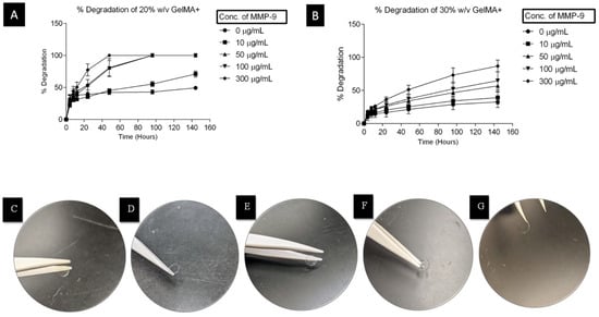 Degradation profile of (A) 20% w/v GelMA+ hydrogel in varying MMP-9 concentrations, (B) 30% w/v GelMA+ hydrogel in varying MMP-9 concentrations, (C) the shape of 20% w/v GelMA+ hydrogel in PBS after 48 h, (D) the shape of 20% w/v GelMA+ hydrogel in 100 µg/mL of MMP-9 after 48 h, (E) the shape of 30% w/v GelMA+ hydrogel in PBS after 144 h, (F) the shape of 30% w/v GelMA+ hydrogel in 100 µg/mL of MMP-9 after 144 h, (G) the shape of 30% w/v GelMA+ hydrogel in 300 µg/mL of MMP-9 after 144 h. The degradation was conducted at 37 °C.