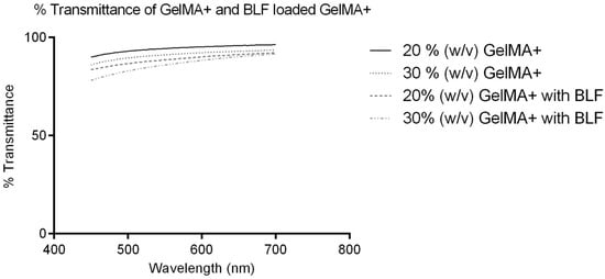 The optical clarity (n = 5) of both the blank 20% w/v GelMA+ and 30% w/v GelMA+ gels and BLF-loaded GelMA+ gels (Figure 4) were measured between 450–700 nm using the Citation 5UV spectrophotometer. The transmittances of the 30% w/v GelMA+ decreased significantly (p < 0.0001) as opposed to 20% w/v GelMA+. The blank 20% w/v GelMA+ gels exhibited approximately 90% transmittance at 450 nm. At 630 nm, the transmittance of 20% w/v GelMA+ was 95.59 ± 1.80%. At 450 nm, the blank 30% w/v GelMA+ gels exhibited 86.07 ± 3.88% transmittance, and at 630 nm, the transmittance was 92.69 ± 2.96%. The 20% w/v GelMA+ gels loaded with BLF exhibited 83.61 ± 3.47% transmittance at 450 nm. At 630 nm, the transmittance of the same gel was 90.82 ± 3.06%. At 450 nm, the BLF-loaded 30% w/v GelMA+ gels exhibited 78.15 ± 2.64% transmittance, and at 630 nm, the transmittance was 89.49 ± 1.29%.