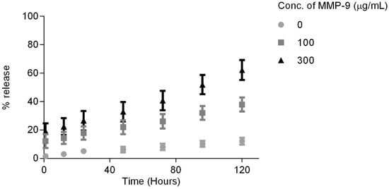 As the 30% w/v GelMA+ was found to be a favourable candidate for the wound healing material, it was chosen as the hydrogel polymer to study the triggered release of BLF dispersed in its matrix over a period 5 days in the presence of varying MMP-9 concentrations. The GelMA+ was able to release BLF over the specified study period in an increasing manner (Figure 5). The release kinetics of BLF from the gels did not show a burst release within the first hour, which is normally observed in drug release studies from hydrogels [15,18,19,83]. It was hypothesized that the initial wash step for an hour removed most of the loosely bound BLF on the surface or sub-surface of the gels, which was around 14% of the total therapeutic concentration, which could have contributed to a burst release. In the absence of MMP-9, only 12.06 ± 3.41% of the total BLF was released after 120 h, which was due to passive diffusion. The overall results showed that the release of the BLF is dependent on both diffusion and enzyme concentration but with a higher impact from the latter. Thus, it is possible to control the release of the drug therapeutic from the GelMA+ by adjusting the polymer and enzyme concentration. Depending on the enzymes available at the wounded site, the GelMA+ gels can be formulated similarly so that they degrade completely in situ, releasing the therapeutic or drug to assist in wound healing.