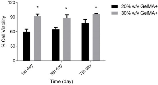 Table 1 shows the swelling ratio and the water content of 20% w/v and 30% w/v GelMA+ hydrogels (n = 4). Both formulations of GelMA+ substantially were swelled over 24 h in the presence of PBS to ensure that an equilibrium was achieved. After 24 h, it was observed that the 20% w/v GelMA+ gels swelled more (p < 0.05) than the 30% w/v GelMA+. The water content of 20% w/v GelMA+ gels was significantly higher as compared to 30% w/v GelMA+ gels (p < 0.05).