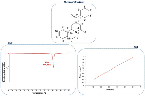 Chemical structure with atom numbering, DSC and IDR of (RS)-PZQ. Adapted from References [58,59].