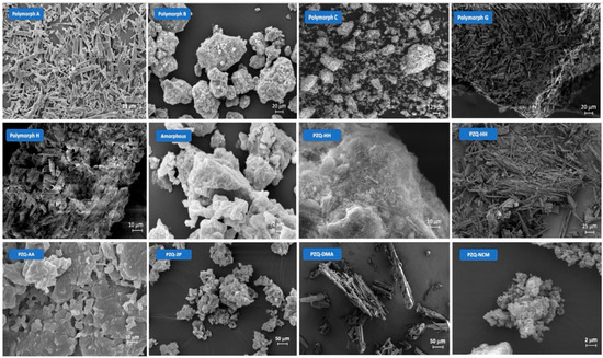 SEM images of polymorph A (500×), polymorph B (1000×), polymorph C (50×), polymorph G (295×), polymorph H (775×), amorphous form (5000×), PZQ-HH (1000×), PZQ-HH from CO2 supercritical (500×), PZQ-AA (1500×), PZQ-2P (370×), PZQ-DMA (160×), and PZQ-NCM cocrystal (5000×). Adapted from references [59,60,62,64,65,66,73].