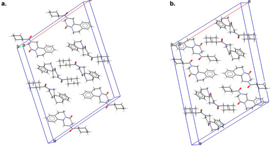 Specifically, (RS)-PZQ, commonly known as Form A and indexed as TELCEU in the Cambridge Structural Database (CSD [79]), crystallizes in the triclinic space group of P-1, showing four crystallographic independent molecules in the asymmetric unit (ASU). Two of the four molecules are disordered (i.e., orientational disorder in the cyclohexyl segment) due to the presence of two rotamers, as attested by dynamic 1H NMR measurements [19]; however, all carbonyl groups of PZQ molecules in the unit cell are positioned in the syn conformation [58,80,81].