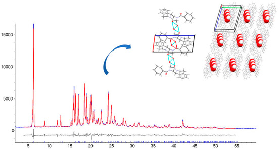 Rietveld refinement from the experimental pattern and crystal structure with packing and H-bonds motifs of PZQ-HH. Adapted from Reference [64].
