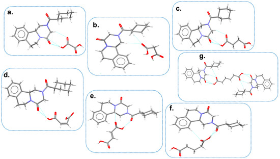 - Espinosa-Lara, J.C.; Guzman-Villanueva, D.; Arenas-García, J.I.; Herrera-Ruiz, D.; Rivera-Islas, J.; Román-Bravo, P.; Morales-Rojas, H.; Höpfl, H. Cocrystals of Active Pharmaceutical Ingredients-Praziquantel in Combination with Oxalic, Malonic, Succinic, Maleic, Fumaric, Glutaric, Adipic, and Pimelic Acids. Cryst. Growth Des. 2013, 13, 169–185. [Google Scholar] [CrossRef]