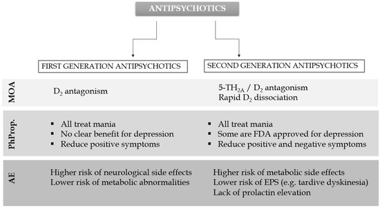 A schematic comparison of basic features of FGA and SGA. MOA—mechanism of action; PhProp—pharmacological properties; EPS—extrapyramidal symptoms; AE—adverse effects.
