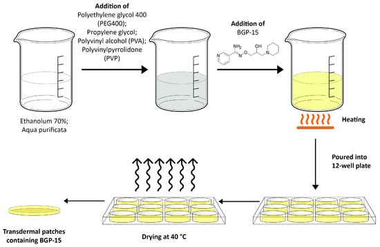 Drug-loaded transdermal patches of BGP-15 were formulated by using the solvent casting method [28]. For this purpose, 12-well plates (diameter 2 cm) were chosen. Polymers (PVA and PVP) were weighed accurately and dissolved in 10 mL of the mixture of water and in ethanol solution of various percentages by volume, diluted from 70% ethyl alcohol and put aside to form a clear solution. The active ingredient (10 w/w%) was dissolved in the abovementioned solution and mixed until a clear solution was obtained. PEG 400 and propylene glycol were used as plasticizers. The resulting homogeneous solution was cast in the plates and dried at 40 °C for predetermined time intervals. The dried patches were further studied from different aspects. The steps of the formulation are presented in Figure 1.