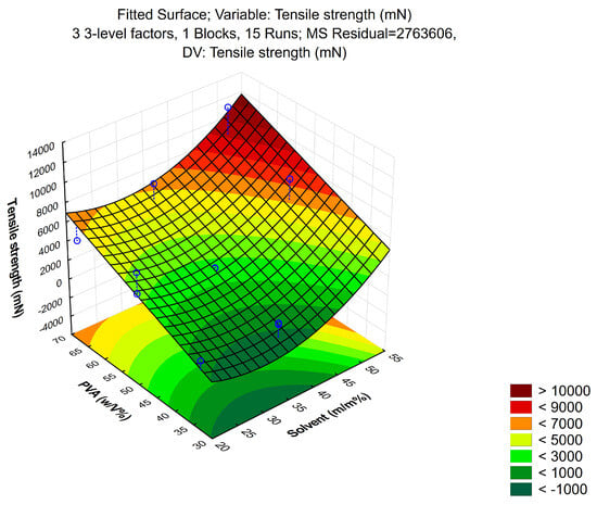 The drying time did not show any significant difference in the tensile strength, therefore, only the correlation between PVA and the solvent was investigated. The curve in Figure 2 shows that increasing the concentration of PVA increased the tensile strength of the patch linearly, and the 3D surface displays that PVA rundown was linear. As for the solvent, a non-linear correlation was observed, and the plot could be well described by an exponential trend. At 20–40 w/w%, a slower increase in the tensile strength was observed, while further increasing the ethanol concentration in the solvent mixture resulted in a faster ascending section.