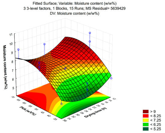 Production of the patches was optimized by using a Box–Behnken design of experiment. During the process, 3 independent and 3 dependent factors were evaluated. Independent variables were the amount of PVA (w/v%), ethanol content (w/w%) and drying time (h); these were considered the critical parameters in the production process with an effect on product quality. The experimental factors were varied in the design, at 3 levels in 15 runs/compositions, which are presented in Table 1. The design of experiments considered the reproducibility and the significant effect of each factor on the observed variables. Tensile strength, moisture content and moisture uptake were taken as dependent variables. The quadratic response surface was used to construct a second-order polynomial model using TIBCO Statistica® 13.4 (StatSoft Hungary, Budapest, Hungary). The 3D response surface plots for dependent factors were plotted according to the regression model by keeping one variable at the center level [29].