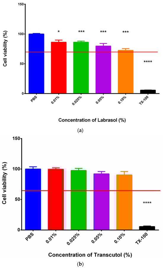 Cytotoxicity of Labrasol (a); cytotoxicity of Transcutol (b). Cell viability was determined as the percentage of PBS. The concentrations used in the formulations proved to be safe in all cases, and cell viability values were above 70% (marked with a red line) in every case. Data represent the mean of 6 wells ± SD. For statistical analysis, the t-test and one-way ANOVA test were carried out. Significant difference is marked with asterisks. *, *** and **** show statistically significant difference at p < 0.05; p < 0.001 and p < 0.0001.