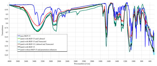 - Transdermal patches without penetration enhancers and BGP-15 were obtained by using a JASCO FT/IR-4600 spectrometer with an ATR accessory (Zn/Se ATR PRO ONE Single-Reflection, ABL&E-JASCO, Hungary, Budapest). All the samples were directly placed on the diamond crystal of the equipment. Scanning was run in the wavelength range of 500–4000 cm−1. The spectra were collected from 32 scans to obtain smooth spectra at the spectral resolution of 1 cm−1. Corrections of environmental CO2 and H2O were carried out using the software’s built-in method [34].