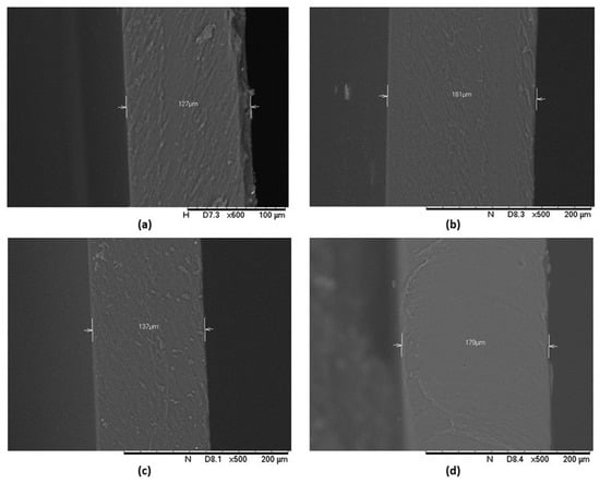 The morphology of the patches was studied via scanning electron microscopy. The photographs confirmed the compatibility of BGP-15 with the polymer matrix as it showed homogeneous films. The thickness of the patches was measured as well; it was between 120 and 190 µm. The scans of the transdermal patches are demonstrated in Figure 7.