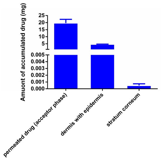 In Figure 9, the results of the in vitro permeation study are presented. In this experiment, the permeation of the patch formulated with the combination of Transcutol and Labrasol was studied across pig’s ear skin. According to the results, 39.3% (19.69 mg) of BGP-15 was able to permeate to the acceptor phase through the skin. In the skin (dermis plus epidermis), 9.2% of the initial BGP-15 was detected. In the case of skin, the flux of BGP-15 was 0.4647 mg/cm2 × h−1.