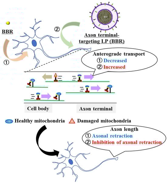 Schematic diagram showing the local delivery of BBR employing the liposome system. Accumulation of BBR in the cell body induced a decrease in the axonal mitochondria transport. Furthermore, it promoted axonal retraction. The use of axon terminal-targeting LPs (BBR) resulted in an increased accumulation of BBR in the axon terminals. As a consequence, anterograde mitochondrial transport was increased and axon-al retraction was suppressed.