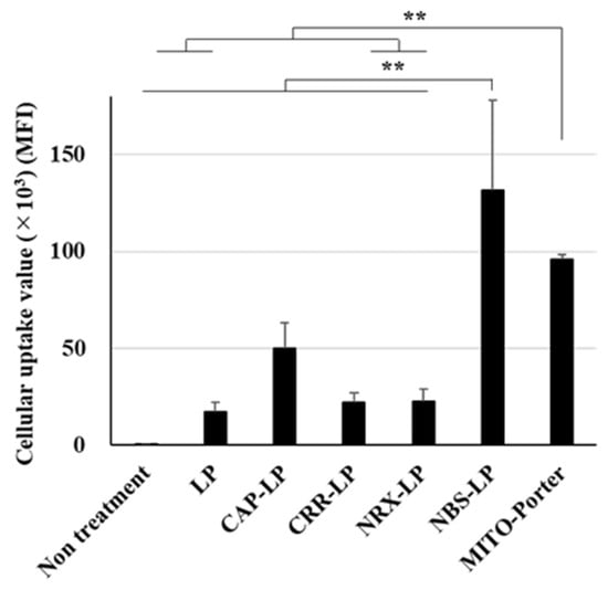 After treating Neuro2a cells with the LPs for 2 h, the cellular uptake was analyzed using FACS. The cellular uptake of the LPs is expressed as the mean fluorescent intensity (MFI). Untreated LPs were used as negative controls. LPs modified with NBS showed a high cellular uptake value (Figure 2). Moreover, the cellular uptake of the MITO-Porter was similar to that of the NBS-LP (Figure 2). This result raises the possibility that NBS-LP may be a useful carrier of LPs targeting neurons.