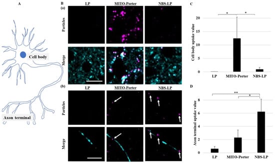 The subcellular localization of LPs into the culture of primary neurons was evaluated using confocal laser scanning microscopy (CLSM). The culture of primary neurons was performed as previously described [18,19]. A distal axonal segment was defined as an axon terminal in this study (Figure 3A). After treating the culture of primary neurons with the LPs, neurons were treated with MitoTracker Green to stain axonal mitochondria. Many LPs were localized in the cell body after treatment with MITO-Porter (Figure 3B(a)). The amounts of LPs in the cell body were about 10-fold higher following treatment with MITO-Porter compared with those treated with either LP or NBS-LP (Figure 3C). In contrast, multiple LPs were localized in axon terminals after treatment with NBS-LP (Figure 3B(b)). The amounts of LPs in the axon terminals were about three-fold higher following treatment with NBS-LPs compared with those treated with MITO-Porter (Figure 3D). These results suggest that NBS-LPs could be used as a drug delivery carrier to axon terminals.