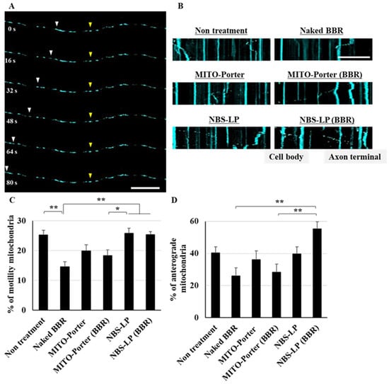 Energy is required for structural changes such as neurite outgrowth and synapse formation. Mitochondrial axonal transport is altered in response to these changes [26]. Therefore, mitochondrial axonal transport changes due to local BBR delivery were expected to affect the axon length. We evaluated axon length using the culture of primary neurons because treatment with naked BBRs has been reported to modulate neurite length [10,11,12]. The use of naked BBR and MITO-Porter (BBR) induced axonal retraction compared with that in untreated samples (Figure 5C). However, MITO-Porter, which can deliver BBR to mitochondria more efficiently, was confirmed to partially suppress this effect. On the other hand, treatment with NBS-LP (BBR) increased anterograde mitochondrial axonal transport compared with that of treatment with both naked BBR and MITO-Porter (BBR). We surmised that this may have satisfied the energy demand at the axon terminals, thereby suppressing axonal retraction (Figure 5C). This is consistent with previous studies such as axonal regeneration [27], suggesting that local regulation of mitochondrial axonal transport plays an important role in changing neuronal function.