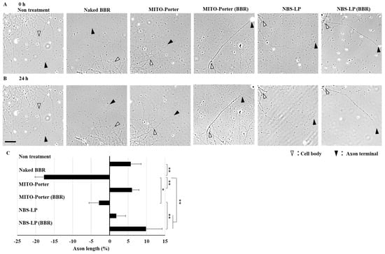The axons of the cultured primary neurons were observed just after or 24 h after treatment with LPs using CLSM. The axon lengths of the primary neurons were evaluated via the bright field images of two time points using ImageJ software (Figure 5A,B). Treatment with naked BBR decreased axon length by about 20% compared with that of untreated samples. Moreover, treatment with MITO-Porter (BBR) decreased axon length by about 10% compared with that of untreated samples. In contrast, treatment with NBS-LP (BBR) increased axon length by about 5% compared with that of untreated samples (Figure 5C). This result raises the possibility that the delivery of local BBR into axon terminals suppresses axonal retraction.
