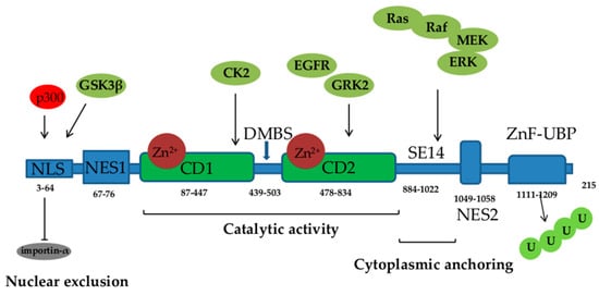 The catalytic activity of HDAC6 is affected by its subcellular localization and regulated by posttranslational mechanisms such as phosphorylation and acetylation that increase its activity. Phosphorylation of threonine (Thr), Ser, or Tyr residues of HDAC6 by various kinases (including extracellular signal-regulated kinase (ERK), glycogen synthase kinase (GSK) 3β, G protein-coupled receptor kinase (GRK) 2, protein kinase C (PKC)) and growth factor receptors such as epidermal growth factor receptor (EGFR) augments its enzymatic activity [17,60]. Furthermore, HDAC6 activity can be regulated by modifications of Lys residues, including SUMOylation, ubiquitination, and acetylation. Although the biological consequence of SUMOylation is not known, recent evidence shows that ubiquitination may alter the activity of the target protein without inducing its degradation [61], while Lys acetylation attenuates the enzymatic activity of HDAC6 [52,62]. The predominantly cytoplasmic localization of HDAC6 is influenced by NES and this process is dependent on the chromosome region maintenance protein 1 (CRM1), which is the main protein receptor that facilitates the export of molecules from the nucleus to the cytoplasm [63,64]. Furthermore, the acetylation of the NLS sequence of HDAC6 by histone acetyltransferase p300 contributes to the retention of HDAC6 in the cytoplasm as it blocks the interaction with the nuclear import protein importin-α [26].