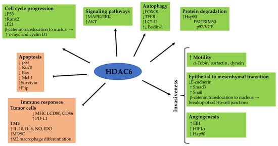 HDAC6 is involved in a plethora of physiological processes (Figure 2) that are often dysregulated in CRC [6,7].