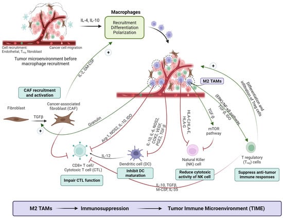 TAMs are crucial components of the tumor immune microenvironment (TIME). Two classic macrophages are the M1 and M2 phenotypes; among them, the M1 macrophage represents the beneficial anti-tumor macrophage, while the M2 macrophage represents the tumor-promoting macrophage. In the tumor region, the recruited monocyte is easily differentiated into M2-type TAMs due to the abundance of Th2 cytokines (IL-4, IL-10, IL-13), limiting antigen presentation and promoting immunosuppression [31]. This hinders the immune system’s ability to recognize tumor cells. The interaction of TAMs with other cells in the tumor microenvironment facilitates the immunosuppressive microenvironment [32].