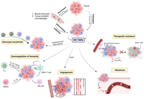 The role of macrophages in TME: In the context of tumor progression, neoplastic cells and stromal cells release specific molecules that act as chemoattractants, such as CCL2 and MCSF-1, to recruit circulating monocytes to the tumor site. Once recruited, monocytes significantly differentiate into M2 TAMs. The predominant M2 TAMs promote the downregulation of tumor immunity, angiogenesis, as well as therapeutic resistance (↓ suggesting decrease) (created with biorender.com, accessed on 17 July 2023).