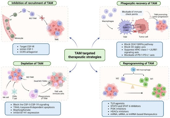 Schematic representation of a variety of therapeutic approaches targeting TAM. Targeting TAMs therapeutic strategies involve inhibiting TAM recruitment and differentiation, depleting or impairing their function, reprogramming M2 TAMs, and promoting their phagocytic activity. Inhibiting TAM recruitment entails blocking chemokine and growth factor signaling while inhibiting TAM differentiation involves targeting factors like IL-4 and IL-13. Depleting TAMs can be achieved through selective elimination using specific markers or immunotherapies. Impairing TAM function targets signaling pathways involved in immunosuppression and angiogenesis. Reprogramming M2 TAMs toward an anti-tumoral M1-like phenotype enhances their anti-tumor activity. Promoting TAM phagocytosis enhances their ability to eliminate tumor cells. Combination therapies, integrating TAM-targeting approaches with other modalities, hold promise for synergistic effects (Created with biorender.com, accessed on 17 July 2023).