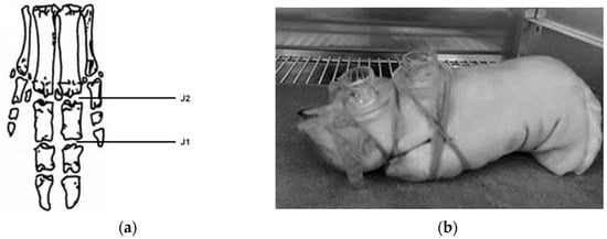 Porcine joint study setup. (a) The anatomical structure of porcine toes with joints J1 and J2 labeled. (b) The setup of the donor compartments for the study.