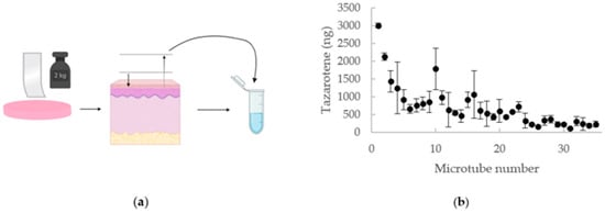 The tazarotene concentration in the SC was determined using the tape-stripping method. The tape-stripping method can provide information about drug distribution within the SC. As presented in Figure 3, the amount of tazarotene in the SC decreased with increased depth into the skin. The total drug amount detected in all strips yields an approximate total of 0.025 mg, or 5% of the drug applied to the skin, retained within the SC.