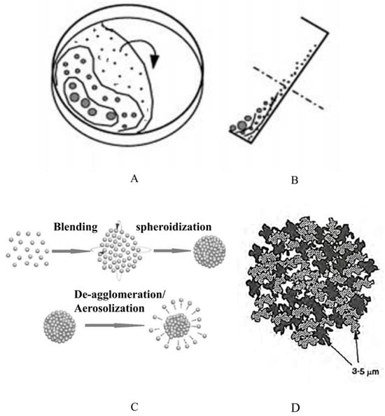 To solve the problems that occur during the conventional production of agglomerate formulations, achieving particle agglomeration under ultrasonic vibration is an alternative for the continuous production of agglomerate formulations with efficient deagglomeration and fine particle dispersion, which was originally reported for the collection of particulate matter of 2.5 μm or less in diameter [17]. Strong aerial ultrasonic waves induce the vibration of fine particles to generate interparticle collisions, resulting in particle agglomeration [18]. This is advantageous for producing agglomerates with loose microstructures that are ready for dispersion, because the spherical agglomerates are subject to continuous rotation during spheroidization, during which the agglomerates slide from the bottom of the coating pan (as shown in Figure 1A,B). The ultrasonic vibration waves are transferred to the agglomerates to induce small-amplitude vibration of the small aggregates to relax or even minimize the interaction points of the aggregates (as shown in Figure 1C,D). Therefore, finer particles and smaller aggregates with lower mechanical strength are present in the agglomerate formulation [19].