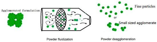 The pulmonary delivery process of agglomerate formulation is shown in Figure 2, which can be divided into four steps: (1) fluidization of DPIs within the inhaler device, (2) deagglomeration of DPIs, (3) transport of fine particles after dispersion through the oropharynx and throat, and (4) deposition of fine API particle in the lungs.