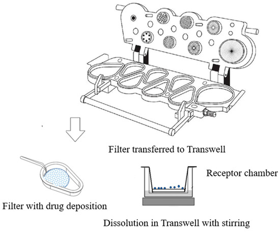 The aerosolized particles from the Turbuhaler® deposited during stage 4 of NGI were collected with an insert Regenerated Cellulose Membrane Filter (RC55, 4.7 cm diameter, and 0.45 µm, Whatman® Corporation, Shrewsbury, MA, USA) on the impactor stage at 60 L/min. The amount of powder collected was estimated based on the previous NGI experiment. After aerosolization, particles deposited on the filter were then obtained from the NGI stage for the dissolution test. A total of 20 mL of the dissolution medium (0.5% v/v tween-80 solution), prewarmed at 37 ± 0.2 °C with a transdermal diffusion cell system (Tianjin Shengda Sanhe Optical Instrument Co., Ltd, Tianjin, China), was filled into the receptor chamber and magnetically stirred; a glass fiber filter was inserted onto the bottom of the Transwell and fixed with a metal clip to avoid medium leakage. The dissolution started with the glass fiber filter acting as a diffusion membrane in contact with the medium, as shown in Figure 5.