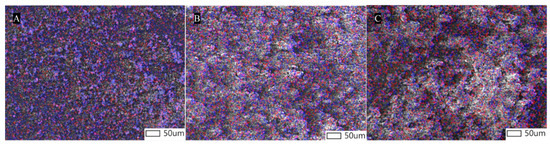 SEM-EDX images of mechanical dry-coating with different concentrations of magnesium stearate: (A) 0.5%, (B) 1%, and (C) 3%. Red represents magnesium and blue represents oxygen.