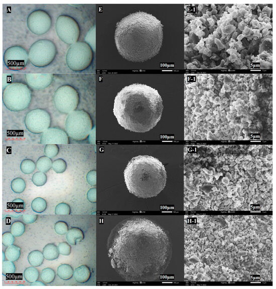 Optical microscope images of agglomerate under ultrasonic vibration: (A) 0 W, (B) 100 W, (C): 200 W, and (D) 400 W; SEM images of agglomerates and corresponding surface: (E,E-1) 0 W, (F,F-1) 100 W, (G,G-1) 200 W, and (H,H-1) 400 W (magnification of microscope for agglomerate: 50×; SEM for agglomerate: 150×, for surface: 3000×).