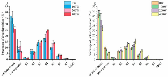 The aerosolization performance of the formulation produced through ultrasonic vibration is listed in Table 5. There was a minor increase in the ED for both budesonide and lactose for power inputs from 0 W to 400 W; the FPF was improved from 36.2 ± 3.0% to 53.2 ± 4.1% for budesonide and from 31.8 ± 4.1% to 52.5 ± 4.6% for lactose. Further observation of the aerosol deposition profile shown in Figure 8 revealed the magnitude of the improvement in the deposition fraction on the NGI stages, which followed the order of stage 4 > stage 5 > stage 6 for budesonide and lactose. Reductions in the deposition on the artificial throat and preseparator could also be observed under ultrasonic vibration, indicating that the breaking up of agglomerate into fine inhalable particles was more efficient after ultrasonic vibration treatment for both components.