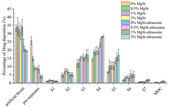 The improvement in aerosolization with ultrasonic vibration could be further illustrated by the lactose deposition on the impactor stage. A significant reduction in deposition of budesonide in the artificial throat and preseparator was observed when followed by ultrasonic vibration, as shown in Figure 6. Aggregates with larger inertia encased the API particles, which fell on the early impactor stages, resulting in lower FPF; the smaller aggregates produced via ultrasonic vibration deagglomerated and progressively broke up into smaller fractions following the collision with the interior wall of device, consequently increasing fine particle detachment [21]. Moreover, ultrasonic vibration contributed to the improvement in fine lactose deposition, which was related to the decreased rupture force liberating more fine particles during deagglomeration. Fine drug particles existed either as individual particles or attach to fine lactose particles to form drug–lactose agglomerates, which were delivered to the impactor stage, resulting in codeposition, which enhanced fine particle deposition, as previously reported [52].