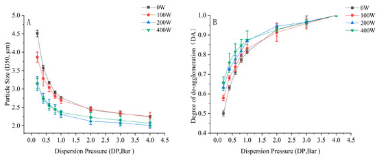 The degree of deagglomeration (DA) at each dispersion pressure was calculated with Equation (2).