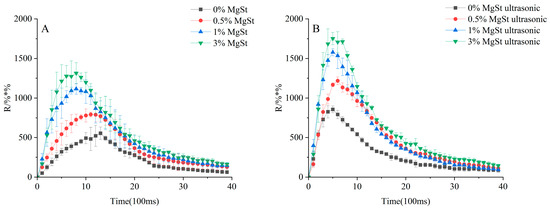 Further investigation of the fine particle dispersion was performed to determine the effect of mechanical dry-coating alone and in combination with ultrasonic vibration on the fluidization and dispersion processes. The release profile of the DPIs is depicted in Figure 12, where the amount of fine particles released presents a trend of first increasing and then decreasing with increasing MgSt concentration in both scenarios. Specifically, the DPIs with 0.5% and 1% showed approximately a 1.5- and 2-fold increases in Rmax compared with that of 0%, respectively. However, there was no significant difference in the RAUC between 1% and 3% MgSt (p > 0.05). Overall, the formulation produced via the combination of ultrasonic vibration and mechanical dry-coating demonstrated had a shorter Tmax and a higher RAUC than that produced via mechanical dry-coating alone with the same MgSt concentration. These results showed that the improved fine particle dispersion of the agglomerate formulation was achieved by combining mechanical dry-coating with ultrasonic vibration, which produced readily deagglomerated particles to facilitate fast entrainment of the fine particles out of the inhaler via airflow.