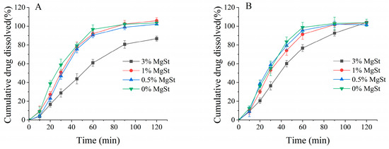 A dissolution study of aerosolized particles on NGI stages was conducted to investigate the diffusion capacity of aerosolized drug particles across a permeable membrane; the artificial membrane acted as an air–liquid interface to mimic the lung’s surface [55,56]. The literature suggests that drug powders coground with MgSt could slow the wetting process and decrease the dissolution rate due to their hydrophobic properties [57]. In this study, the dissolution results revealed that only mechanical dry-coating with 3% MgSt could substantially reduce the dissolution rate. It was also interesting to note that despite the apparent dissolution decreases occurring with higher MgSt concentrations, combining mechanical dry-coating with ultrasonic vibration contributed to a complete dissolution at a 120 min time point and demonstrated an overall faster dissolution rate compared to that achieved with mechanical dry-coating only. These contrary observations could be caused by the better dispersion of the fine budesonide particles with lactose via ultrasonic vibration, which increased the wettability of the API. These results indicated that ultrasonic vibration could better disperse agglomerates and allow for increased fine particle deposition on the diffusion membranes; therefore, the powder wetted faster when contacting the medium, as previously reported in the literature [58,59]. This comprehensive factor indicated the sufficient dispersion of API, which enhanced the solubility and hydrophobicity of MgSt to hinder dissolving. This was only true with lower MgSt concentrations, because the ultra-thin layer of the MgSt coating on the lactose surface may not have been sufficient to hinder water penetration and decrease the dissolution rate, but once the hydrophobic component was increased to a certain limit, slower dissolution rate was observed [47]. For the 3% MgSt formulation, it appeared that drug particles were encased in lactose aggregates and hindered the wettability, resulting in slower dissolution, but ultrasonic vibration dispersed the API and MgSt uniformly, which in turn enabled full dissolution.