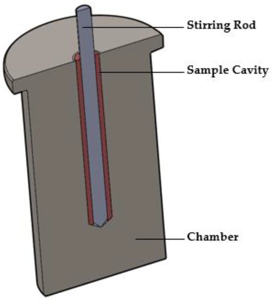 The MiniMixer (Figure 1) is manufactured with stainless steel and consists of two components: the chamber and the stirring rod. The chamber seats inside the well of an aluminum heating block (Chemglass Arex-6 Digital Pro with 28 × 98 mm aluminum block topper for 40 mL scintillation vials), allowing the device to be equilibrated to a given temperature. It is a single piece containing the sample cavity in the center where the physical mixture to be processed is loaded. It is a cylindrical cavity 5 mm in diameter and 37 mm in length, with a 45° bevel at the base. The stirring rod is 4 mm in diameter, with a 45° beveled tip. The stirring rod is controlled by a Ryobi HJP003 12 V power drill with the trigger fully depressed, allowing the stirring rod to spin at 520 rpm. The rotational speed was measured using a tachometer (model 461995, Extech Instruments, Nashua, NH, USA) in non-contact mode, with a small piece of reflective tape adhered to the stirring rod for laser detection.