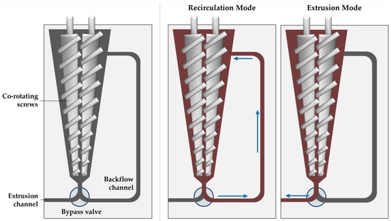 Lab-scale extrusion was performed with the Haake MiniLab 3 micro compounder (Thermo Fisher Scientific, Waltham, MA, USA). The micro compounder (illustrated in Figure 2) has a 7 mL temperature-controlled chamber that houses a set of conical co-rotating screws 109.5 mm in length. Unprocessed material is fed through a port near the back end of the screws, which then convey the material through the backflow channel if the bypass valve is closed (recirculation mode) or out the extrusion channel if the bypass valve is open (extrusion mode).