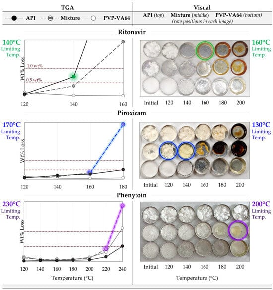 Degradation prescreening results for the three API systems, with the limiting temperatures listed for each test. (Left) TGA results showing the wt% mass loss after 15 min at each temperature, with the dashed lines showing the 0.5–1 wt% thresholds. The colored data highlight those that led to the determined limiting temperature for each system. (Right) Visual assessment results showing images of the samples after being held isothermally for 15 min at each temperature. The circled samples show the data that led to the determined limiting temperature for each system.