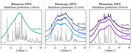 To test these predictions, physical mixtures of various API loadings were prepared and processed on the micro compounder. Figure 4 shows their resultant diffractograms. Micro compounder results were in good agreement with the MiniMixer predictions. For PXCM, a 20 wt% sample appears fully amorphous with no residual crystalline peaks evident, whereas both the 25 and 30 wt% samples show crystallinity. Only one 50 wt% API loading was run for RTV, which appears fully amorphous. For PHY, the 35 wt% sample shows residual crystals, while the 25 and 30 wt% loadings are amorphous. The solubilized API content was quantified by PXRD for the non-amorphous micro compounder samples, as summarized in Table 7.