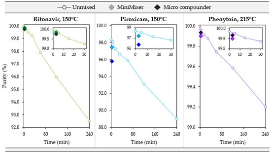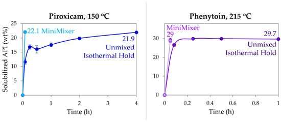 To compare the MiniMixer screening approach to the more typical analytical methods that do not employ mixing (see Table 1), physical mixtures of RTV (50%), PXCM (25 wt%), and PHY (35 wt%) were held isothermally over the course of 4 h, determining the extent of API dissolution by PXRD. All time points for the RTV unmixed samples were fully amorphous as expected, since the isothermal hold was processed above its melting temperature and it is not a rapid crystallizer [52]. The PXCM and PHY results are detailed in Figure 5. At 215 °C, PHY reached its maximum loading of ~30 wt% within 15 min, as evidenced by no further increase in solubilized API up to an hour. This loading shows good agreement to what was achieved with both the MiniMixer and micro compounder. PXCM, on the other hand, requires greater than 2 h to reach >20 wt% solubilized API compared to the >20 wt% loadings achieved in 3 min with the MiniMixer and micro compounder. While the unmixed sample reaches the same extent of solubilized API after 4 h, the data over time do not appear to level off, as was observed with PHY, indicating this is not the thermodynamic solubility.