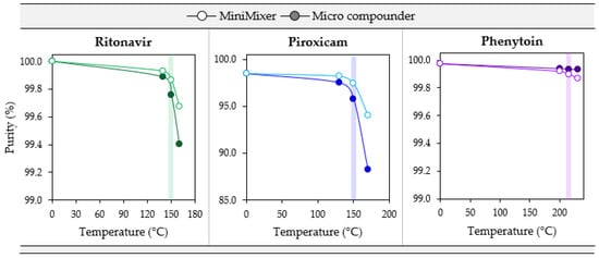 The second round of processing was conducted in order to determine the purity over a range of temperatures and compare results between the two processing methods. The temperatures used in this round are the gravimetrically and visually determined limiting temperatures (see Section 3.1). These used a single API loading, one determined to be amorphous from round 1 (see Section 3.3).