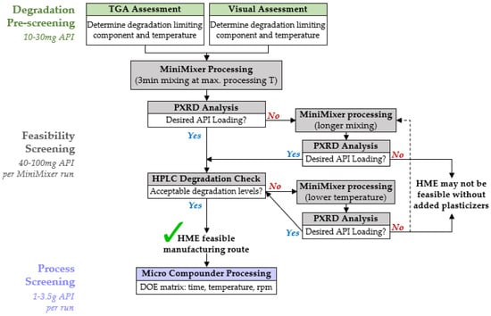 A flowchart is presented for screening the feasibility of manufacturing an ASD by HME using less than 200 mg of API. This procedure is aided by the use of a simple device called the MiniMixer, which allows for simultaneous heating and mixing of a sample at HME-relevant temperatures and times. The applied mixing at temperature offers significant advantages over current milligram-scale HME screening approaches, resulting in API loading and degradation predictions closer to what can be achieved in an extruder with minimized experimental time and material burden. This screening process can easily be used to assess the HME manufacturing feasibility of a given API in any extrudable polymer. Thus, implementing this screening process can generate valuable information with regards to HME processing using only sub-gram quantities of API.