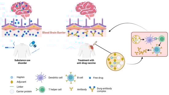 Potential detrimental effects of SUDs on various organ systems have been observed, with the most significant impact being on the central nervous system (CNS). Given the CNS’s inherent vulnerability to the adverse effects of drug abuse, immunotherapy emerges as a particularly effective therapeutic approach for addressing drug addiction, particularly when the CNS is involved. There are two key mechanisms underlying the effectiveness of immunotherapy for CNS-mediated drug addiction (Figure 1). The initial mechanism centers on the binding of drug molecules to antibodies, which are too large to pass through the blood–brain barrier (BBB) and penetrate into the brain. This action decreases the amount of free drug circulating and hampers the drug’s interaction with brain receptors, thereby mitigating its effects such as addiction, respiratory depression, and bradycardia. The secondary mechanism is characterized by decelerating the rate at which abused drugs reach the brain []. Antibody–drug binding has been shown to increase the half-life of the target drug. This is attributed to that the drug, once bound to the antibodies, becomes protected from enzymatic degradation. Consequently, this reduction in the drug’s clearance from the body results in an extended presence of the drug–antibody complex in circulation. This prolongs the period during which the drug is sequestered and prevented from interacting with its targets, such as receptors in the brain or other organs, thereby attenuating the pharmacodynamic effects of drugs []. Together, these mechanisms contribute to the vaccine’s ability to counteract ongoing drug overdose or diminish the reinforcing effects of the drug. By leveraging these mechanisms, immunotherapy holds a promise as a strategy to mitigate the impact of drug addiction, particularly when the CNS is significantly impacted. Further research is essential to refine and validate these mechanisms and their therapeutic potential.