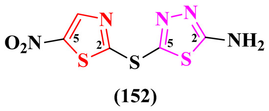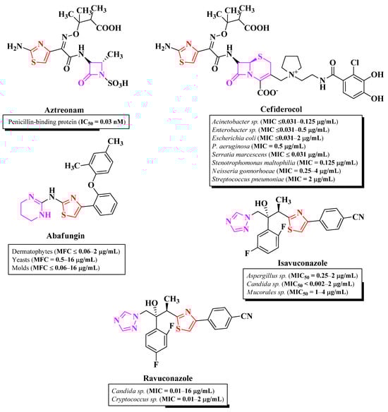 Thiazole is a five-membered heterocycle, part of the azoles group containing one nitrogen heteroatom and one sulfur heteroatom. It is found in a series of authorized antimicrobial drugs, such as aztreonam, and various cephalosporins (including the newest cefiderocol), abafungin, isavuconazole, ravuconazole, ethaboxam, and myxothiazol, thus underlining the importance of this nucleus for antimicrobial activity [3,4,5] (Figure 1). The effect of the thiazole nucleus on the biological activity of a molecule can be influenced by clubbing it directly or through a linker with other moieties with pharmacological potential, thereby creating hybrid compounds [6].